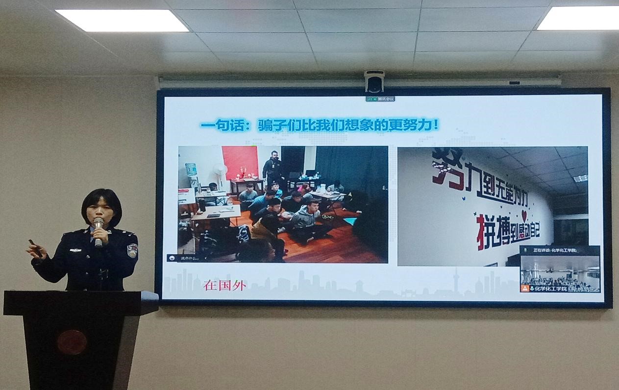 民警任勤勤同志首先播放了我校同学拍摄的有趣的防诈视频,向同学们展示了每年开封高校被骗的学生数目及巨大金额,并强调了诈骗犯罪对人们群众财产安全的重大危害。随后,任勤勤通过真实的发生在我们身边的案例,用风趣幽默的语言向我们介绍了电信诈骗犯罪的特点和内容,解析了如刷单刷信誉诈骗、杀猪盘、冒充客服诈骗等在大学生中常见的诈骗陷阱。