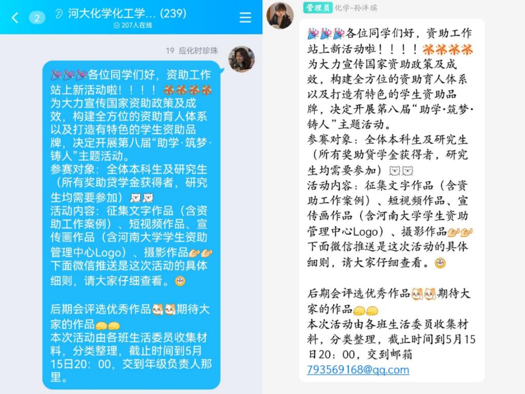为提高同学们参与本次主题活动的积极性,激发他们创作的灵感,化学化工学院通过文件、推送等方式动员学生参加。学院资助站站长田梦老师在工作群动员各年级辅导员广泛宣传,并在资助工作会议中强调此次活动的重要性,在各年级详细讲解活动的参与方式、作品要求、评奖办法、奖项设置等要求。为调动同学们参加活动的积极性,各年级资助负责人在活动期间也多次宣传活动、更新要求。