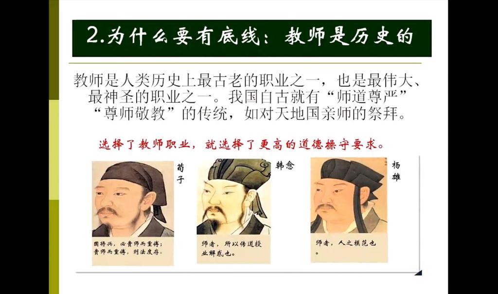 其次从教师底线出发,分别阐述教师在政治、法律、纪律政策、道德四方面的底线内容,从历史、现实及未来三方面解释了教师要有底线的原因。并指出对于教师来说要想立德树人就应该以德育德、以爱传爱、以行导行。