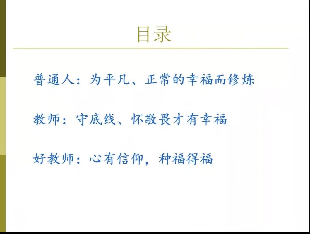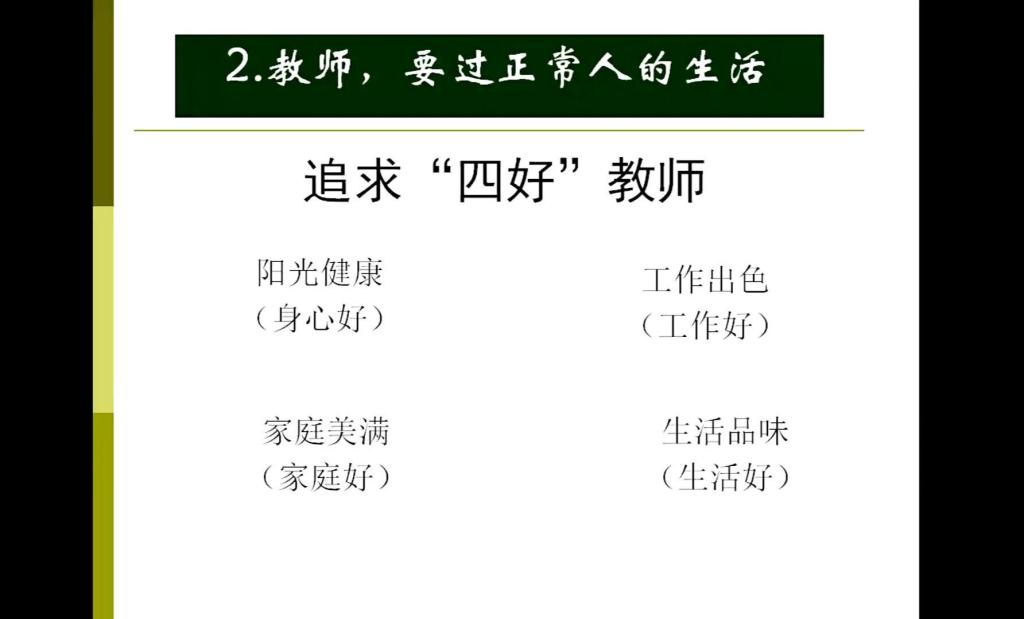 第三点从教师的价值观和原则出发结合生动例子,分别从于人,于国,于己三个角度解析好教师:心有信仰,种福得福。王晓飞提出教师为党和国家育人育才是教师的使命,教师要做学生生命中的贵人,为学生的终生发展和幸福奠基,唤醒学生巨大的潜能,激励学生成为更好的自己,向善向美的发展,对于教师自身而言,享受教育,方可爱返福至。