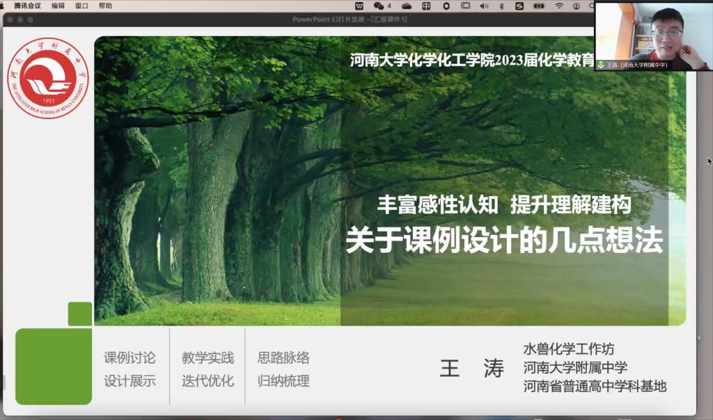本次讲座的主题为:关于课例设计的几点想法。首先,王涛以不同版本高中教材里关于烯烃炔烃的讲解进行课例讨论,针对原有教学出现的问题提出:课例设计要丰富学生感性认知,提升学生理解建构的观点。随后,王涛通过展示自己的教学课程设计和迭代优化的教学实践,向同学们传授了丰富的课程设计经验。在设计展示中,王涛强调,要尽量采用混合式学习模式,通过大量直观素材和多角度、层层递进的问题设计加深学生的认知、理解和应用。在教学实践中,他提议通过实验,模型展示等让学生更好地理解所讲知识。以萃取为例:王涛通过“青蒿一握,以水二升渍,绞取汁,尽服之”引出萃取,并用趣味实验让学生感受萃取。在讲解化学反应的本质这一知识点时,他提议通过将宏观现象微观模拟的方法使学生明白其本质。最后,王涛做出归纳梳理,他认为讲好一节课首先要确定核心主题,核心主题的确定可以通过课标以及有经验教师的示范课,之后需要设计思考讨论的环节,尽可能增加与学生间的交流,让学生完整地说一句话,表达自己的观点,而不是只回答是或不是。分享结束后,实习指导老师冯彩霞对王涛在非常时期、百忙之中作精彩报告表示由衷感谢。