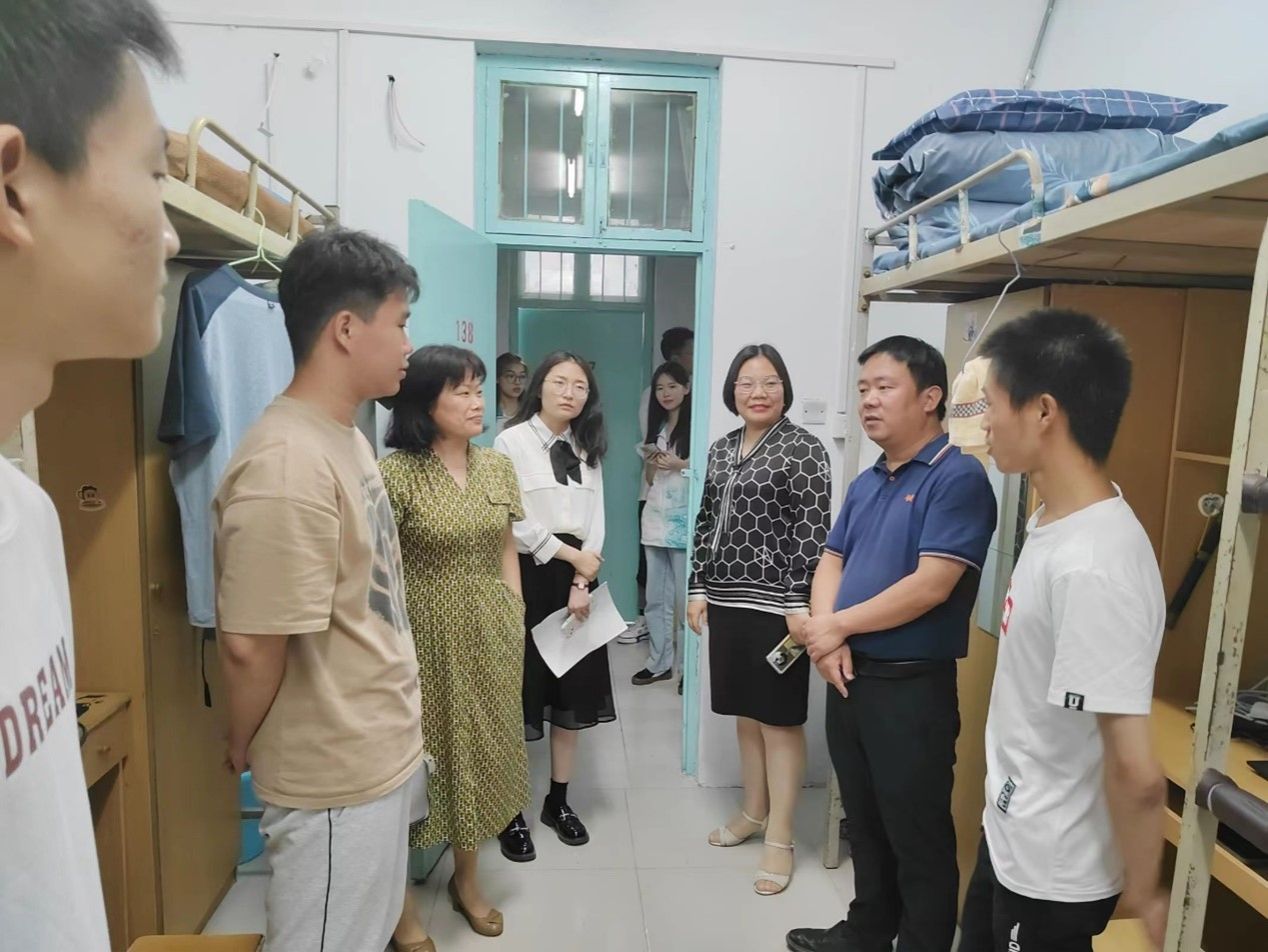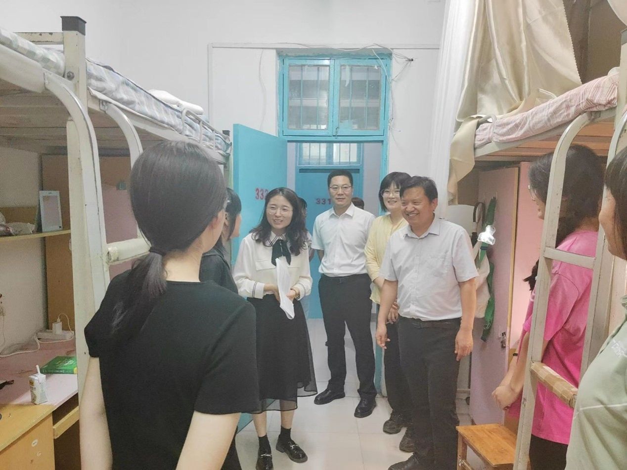 领导们分成两路,学院党委书记常凤香、副院长屈建莹、吴玉锋、党委办公室主任兼2022级辅导员宁攀,前往男生宿舍;党委副书记马文海、副院长张磊、团委书记兼2020级辅导员郭佳、2023级新生辅导员田梦,前往女生宿舍。学院领导与同学们进行了亲切的交流,了解到同学们来自五湖四海,询问了同学们是否适应,有没有困难。同学们纷纷表示八叉书库