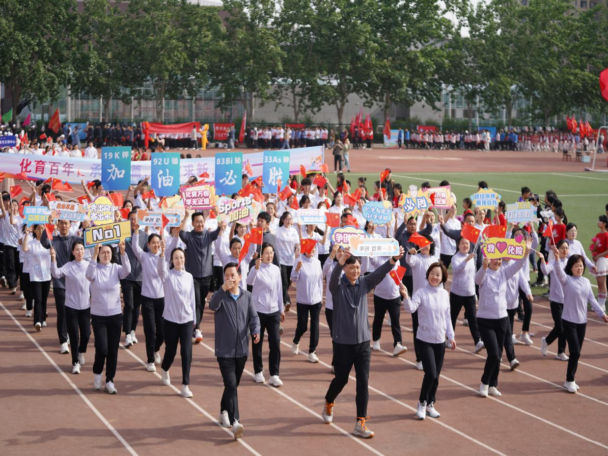 方阵以党委书记常凤香为领队,教职工们身着统一的服装,手中挥舞着红色国旗,举着“化育万物,学无止境”“争创世界一流”“Sports 加油”“秀出风格,赛出水平”等各类标语,精神抖擞。同学们身穿印有化学结构式的白色短袖,组成的方阵秩序井然,他们迈着整齐划一的步伐,举着醒目的旗帜——“化育百年,承启新篇,提质求新,争创一流”,体现了八叉书库