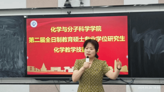 屈建莹做最后总结。她首先对与会专家表示感谢,也对同学们的精彩展示给予了肯定。同时指出,作为未来高层次人才的研究生,同学们应该以此次大赛为契机,一要科学严谨、注意细节;二要加强研究、注重创新;三要交流学习、完善提高,不断提升自己的实践能力和研究能力。学科教学(化学)学位点作为学院专业学位人才培养的重要平台之一,将持续深化实践育人、创新育人、科研育人理念与实践,通过全院师生共同努力,不断提升学科教学(化学)研究生培养质量,助推化学学科筑峰和学校“双一流”建设。