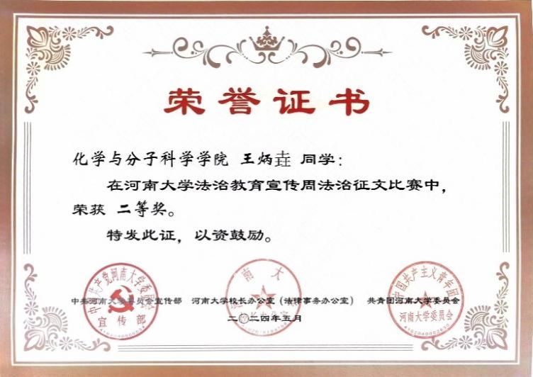 2023级化学类一班、化学类二班分别荣获法治主题班会视频征集比赛一等奖和三等奖、2022级王炳垚同学荣获法治征文比赛二等奖,学院荣获法治教育宣传周活动优秀组织奖。