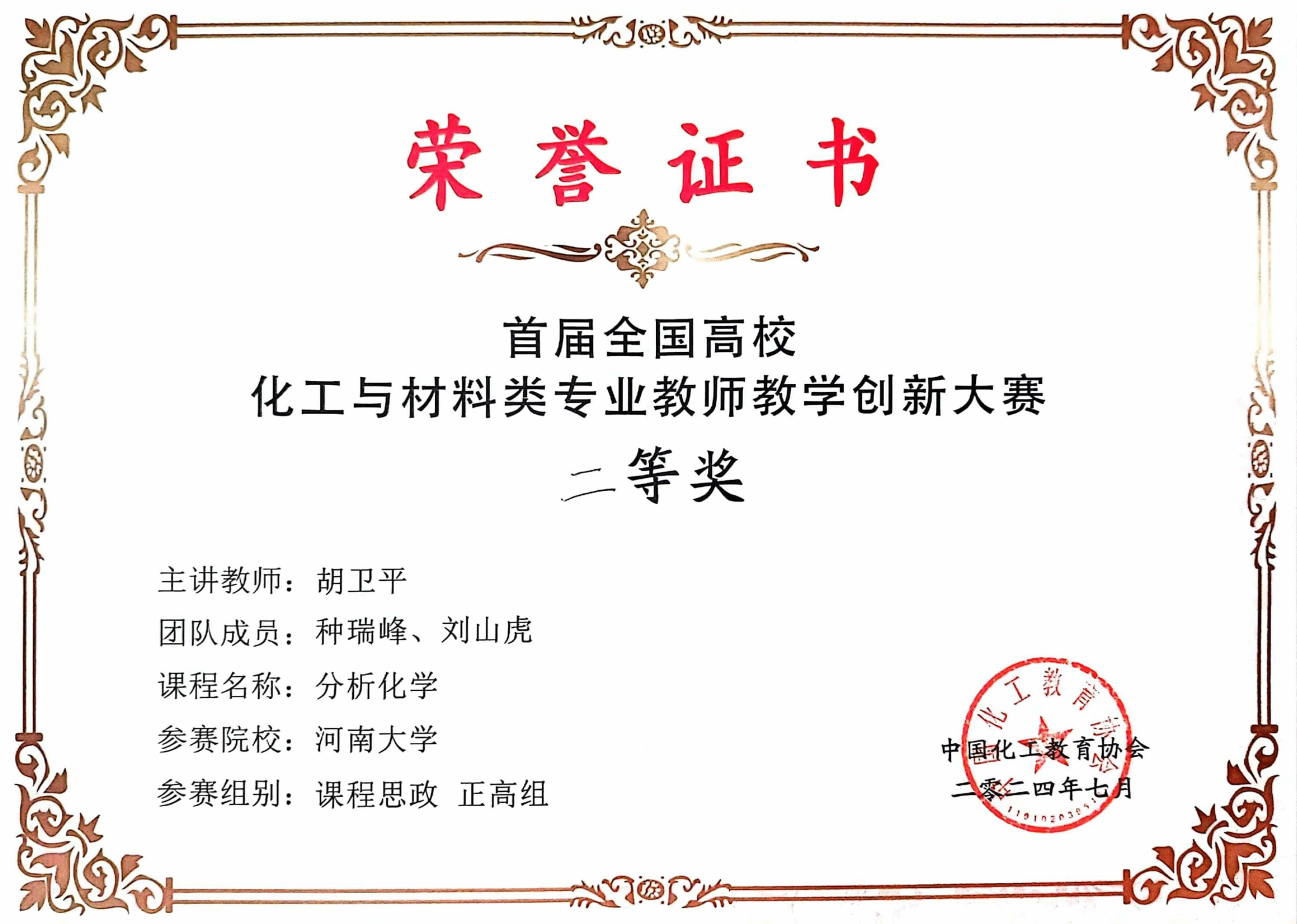 分析化学教学团队负责人胡卫平教授经过学校初选、大赛预赛,在全国50余所高校90支参赛队伍中脱颖而出,闯入决赛,最终获得了课程思政正高组二等奖。