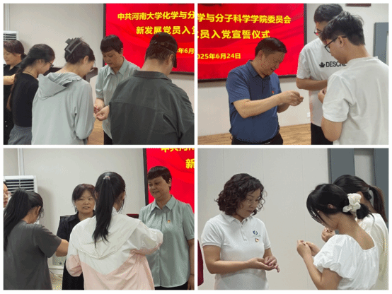 仪式在雄壮的国歌声中拉开序幕。宣誓仪式上,学院党委委员向新党员同志发放党员徽章并合影留念。