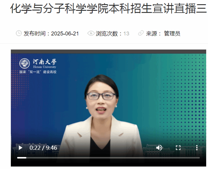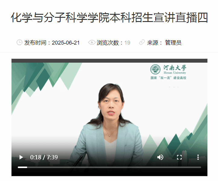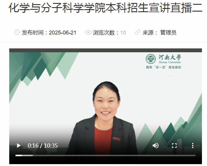 学校公布2025年招生简章和招生计划后,印制学院招生宣传册,及时对学院官方网站招生宣传专栏中的招生简章、招生计划、专业解读、咨询电话等内容进行更新,学院微信公众号同步推出,尤其是对我校化学专业2025年新增“林伯襄实验班”进行重点宣传。执行院长徐元清参加学校招办组织的院长说专业线上直播,胡卫平教授、付记亚教授、李亚敏教授作为宣讲专家参加了学校招生线上直播。2023级本科生王舒心录制了《学姐说专业》招生宣传视频。录制视频在学院网站常年播出。