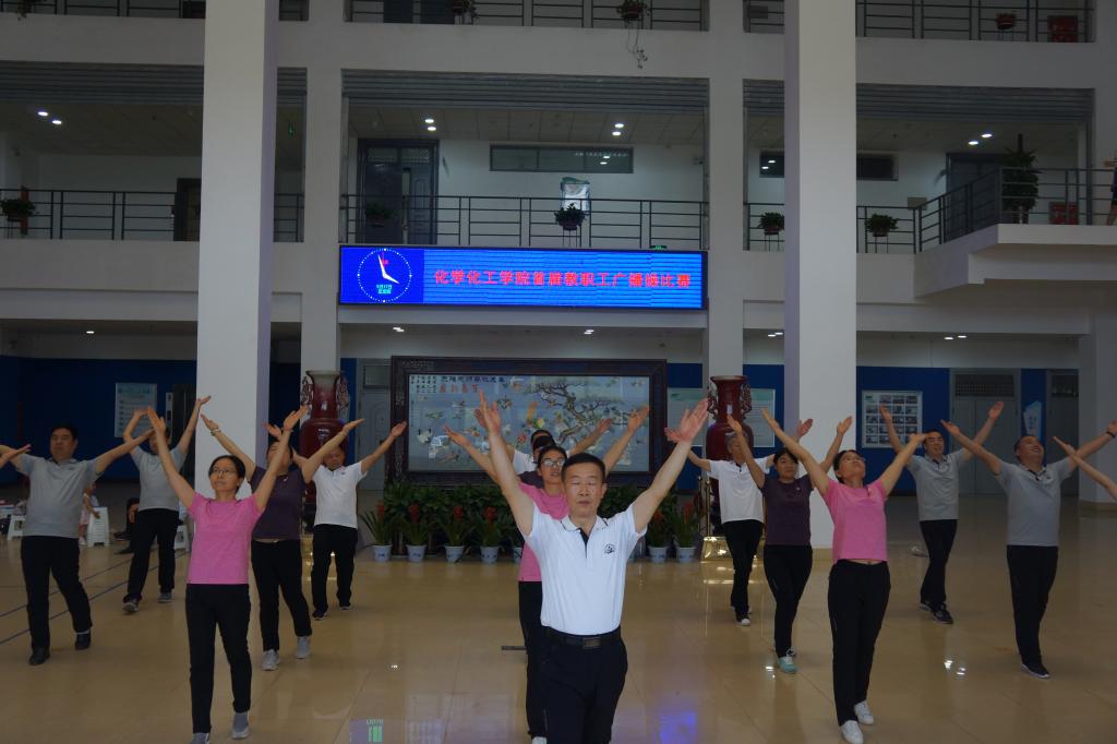 为进一步增强教职工体质,丰富教职工文化体育生活,5月17日下午,化学化工学院举办首届教职工广播体操比赛。校工会主席沈洁霞、副主席罗莉、焦峰、宋菊芳等工会领导应邀参加。比赛由国际教育学院副书记、工会主席李从国,数学与统计学院副书记、工会主席王中国及体育学院四名学生担任评委,化学化工学院教师陈欣主持,学院全体教职工参加。