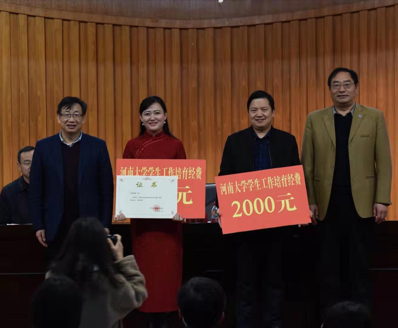 党委办公室主任王路娟,她获得教育部第十届全国高校辅导员年度人物“提名奖”,河南省普通高等学校第二届“大美学工”十佳优秀学生工作者。学校对获奖个人所在学院颁发学校学生工作项目培育经费,以资鼓励。接下来分别对其他优秀个人进行颁奖。