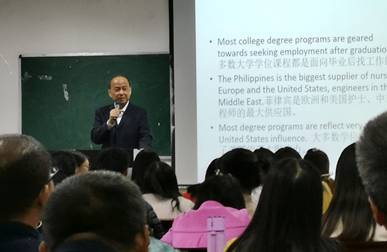 Rio还做了题为“Philippines and China education and cultural heritage”的报告。报告会由院长助理许英主持。报告主要介绍了菲律宾的教育、管理、文化与中西方教育文化的交融、传承与差异以及在学科教学研究方面的最新思想与研究进展。Rio教授的报告旁征博引、幽默生动,得到了学院师生以及国培骨干教师的热烈响应。在提问环节,师生们就一带一路战略的影响、中西教育差异、教育科学研究等问题与RIO教授进行了热烈的讨论。