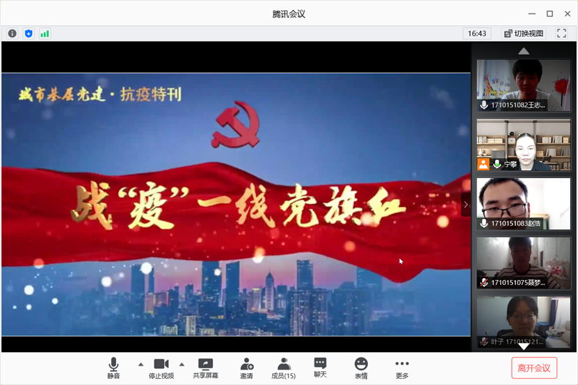 最后,宁攀做总结发言。她指出,虽然疫情凶险,但在党中央的正确领导下,我们一定能够共克时艰,取得这场疫情防控阻击战的最后胜利。作为大学生党员,虽不能奋战在抗疫一线,但可以积极配合国家和学校的疫情防控工作,少出门,少聚集,引导身边的人科学防控,每天按照学校要求填报健康状况,协助村委会或社区做一些力所能及的防疫工作,这也同样是在为国家做贡献。在中国共产党成立99周年之际,让我们每名党员牢记神圣使命,不忘初心嘱托,在新时代、新征程上不断创新,做一名新时代合格的学生党员。