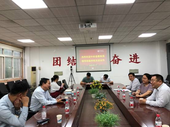6月17日下午,中牟县教育体育局副局长吴玉杰一行四人到访学院,洽谈合作事宜。学院党委书记乔梁、常务副院长柏䶮、党委副书记马文海和副院长刘学军在220会议室接待了来访客人。