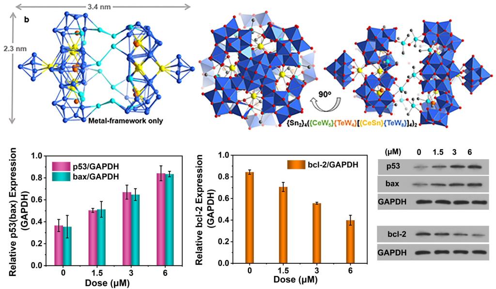 高核金属嵌入的钨氧纳米团簇的结构化和功能化一直是多酸化学家的研究目标。然而,如何平衡各组分的竞争作用并实现它们高度选择性的连接控制是实现多组分分层组装的分子纳米结构所面临的一个重大挑战。赵俊伟教授课题组结合其在制备高核钨氧簇的基础研究工作,提出了多组分的一步自组装策略,利用两种阳离子连接单元(有机金属和稀土离子)来驱动缺位钨氧阴离子聚集形成巨大的分子金属氧化物簇,突破了有机金属–稀土异金属多组分组装的钨氧纳米团簇领域的发展瓶颈,并通过体内和体外测试深入地评价了该高核金属团簇的抗肿瘤活性,探究了其抗癌机制。该工作为多组分组装的纳米团簇的制备提供参考,推动了高核钨氧团簇在抗癌领域的研究进程。