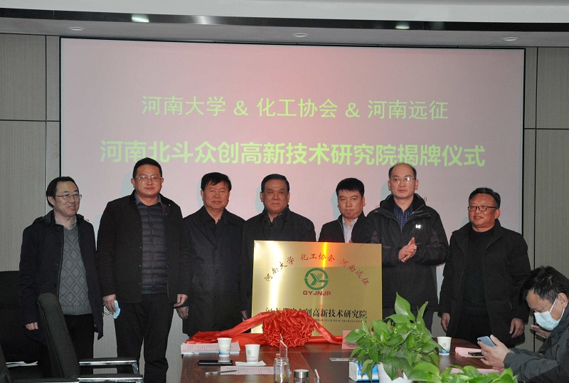 化学化工学院党委书记翟新礼、市工信局副局长王坤杰、科技局副局长赵振宪、会长王福贞共同为北斗高新技术研究院揭牌。