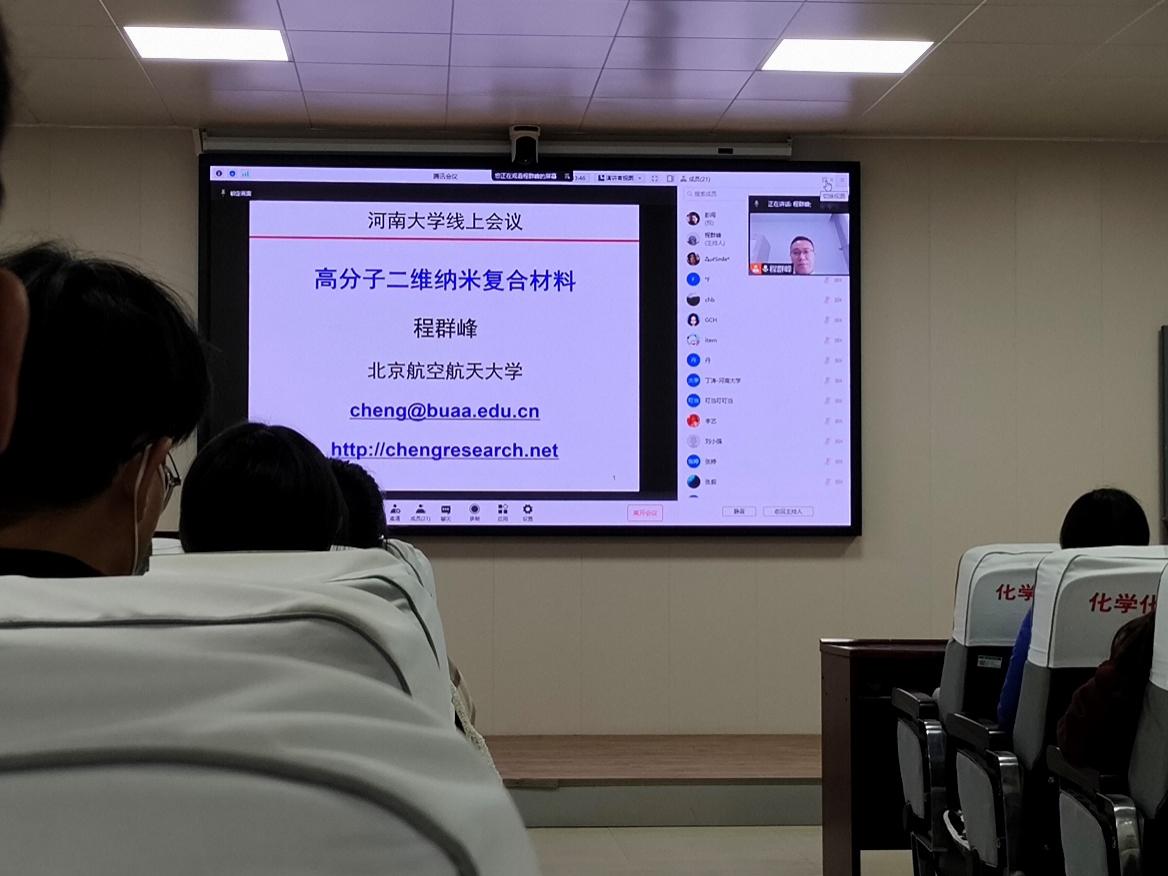 11月17日上午,应化学化工学院邀请, 学院1999级校友、国家杰出青年基金获得者、北京航空航天大学化学学院副院长程群峰教授做了一场题为“高分子二维纳米复合材料”的网络报告。化学化工学院教师和研究生近百人在226会议室聆听了报告。会议由副院长徐元清主持。