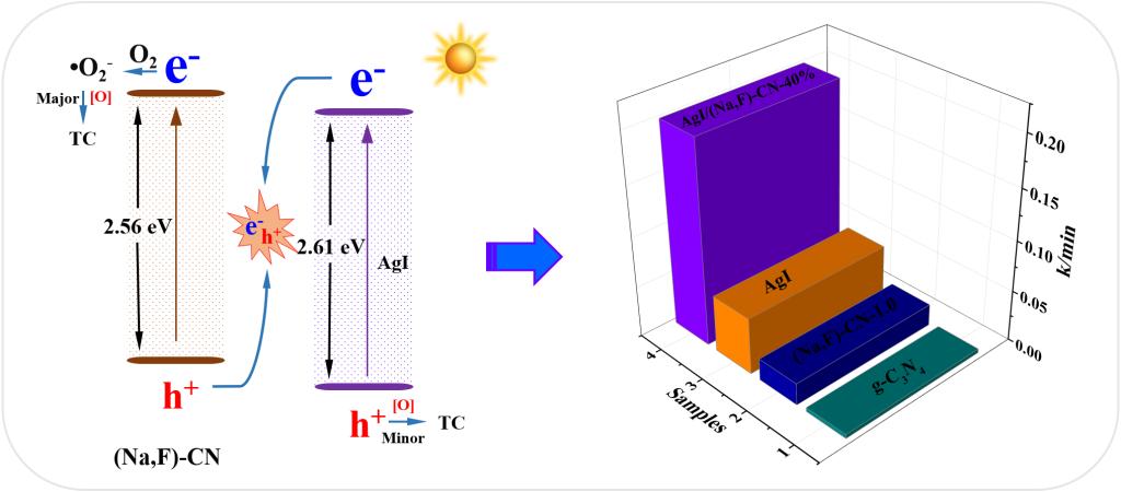 构建Z-Scheme异质结复合材料是提高电荷分离和光催化活性的有效手段之一,近年来在能源与环境光催化研究领域引起了广泛关注和研究。本文利用Z-Scheme光催化系统在增强电荷分离与保持高氧化能力优势的同时,结合元素掺杂的策略实现了AgI/(Na,F)-CN复合材料显著提高的电荷分离特性与催化氧化性能。令人振奋的是,该复合材料可以在几分钟可见光照射下实现高浓度抗生素废水的完全催化氧化降解与转化,未来有望用于高毒性制药废水等难降解新兴有机污染物的净化处理。