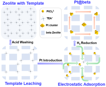 本研究报道了一种利用模板剂诱导途径合成beta分子筛(BEA-type)封装高分散贵金属(Pt)的策略。如图1所示,将水热合成的beta分子筛使用酸洗去除部分模板剂。随即采用离子交换法,利用beta分子筛中孔道内TEA+分子与金属离子(PtCl62-)的静电结合作用,将金属纳米颗粒区域选择性封装于分子筛孔道交叉处。通过后续热处理过程,在宽硅铝比范围下(Si/Al=15~200),制备出了具有高分散金属特性的beta分子筛封装金属Pt催化剂。其在酚类化合物的加氢脱氧反应表现出极佳的催化活性。不同于传统合成策略,此项研究成果提供了一种宽硅铝比条件下的分子筛封装金属催化剂合成的崭新思路(Angewandte Chemie International Edition 2021, DOI: 10.1002/anie.202108059)。