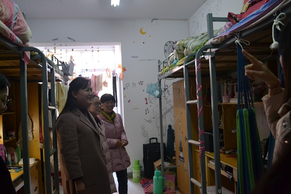 22日中午刚召开完2014级诚信教育和校园安全教育专题年级大会,王路娟顾不上吃午饭,会议结束,从学院报告厅走进北院学生宿舍,看望同学们并与同学们进行亲切的交谈。“学生工作无小事”这是王路娟老师经常对同学们说的,她自己以实际行动践行着,同学们看到王路娟老师为了同学们的成长成才辛勤的付出,都十分感动,心疼不已。走进女生寝室,看到同学们衣衫单薄,王路娟面露心疼之色,她表示,好的身体才是革命的本钱,叮嘱同学们注意保暖,照顾好身体,以良好的精神面貌积极备考。走访了女生各寝室,看到同学们相处融洽,和谐友好,王路娟倍感欣慰,她表示大学友谊是同学们一生受益的宝贵财富,希望寝室各个成员之间继续和谐相处、互帮互助,营造和谐的宿舍氛围,建立纯洁美好且珍贵的大学友谊。走进男生寝室,看到寝室干净整洁,书桌洁净,被褥整齐叠放,王路娟老师肯定并表扬了男同学们做文明学生的良好表现。提及宿舍用电安全问题,王路娟要求同学们在宿舍不要使用变压插座、电饭锅、电热毯、暖手宝等具有安全隐患的电器。对此,王路娟老师虽面色坚决、语气严肃,但言语中却流露出她对学生满满的关心和爱。此外,在走访了男、女生寝室中,对同学们提出的“卫生间漏水、墙壁掉皮、房顶掉皮”等问题,王路娟表示她将尽快上报学校有关部门,有效解决此类问题,近日给同学们答复,给同学们提供一个舒适的居住环境。