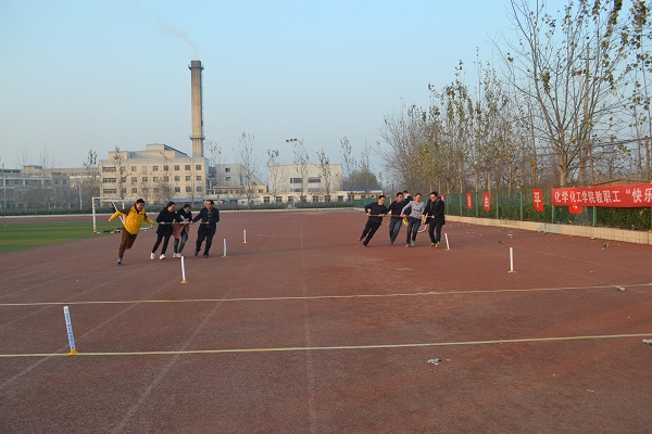 紧接着进行棍推乾坤活动。该项目要求4名队员同心协力,手持一根木棍共同穿越各个障碍,充分考验了教职工身体协调性和小组团队协作性。有的团队以速度取胜,有的团队则稳中求胜,方式各样,各显神威。最终,行政组荣获第一,材料组和化工组分别获得第二名和第三名。