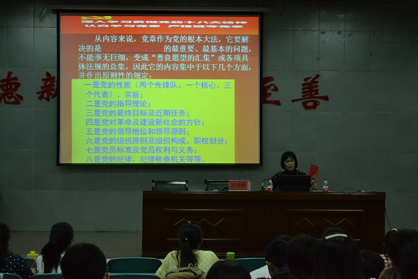 张秋梅以“党的章程”为出发点,结合自己多年的组织发展工作经验,深入浅出的解读了党章的地位、作用和意义。并提出了组织对党员的要求,为今后成为一名合格的共产党员明确了方向。她结合学院学子在2014年秋、春季运动会、大学生挑战杯、校园之星评选中取的成绩,以及2015年考研率、八叉书库