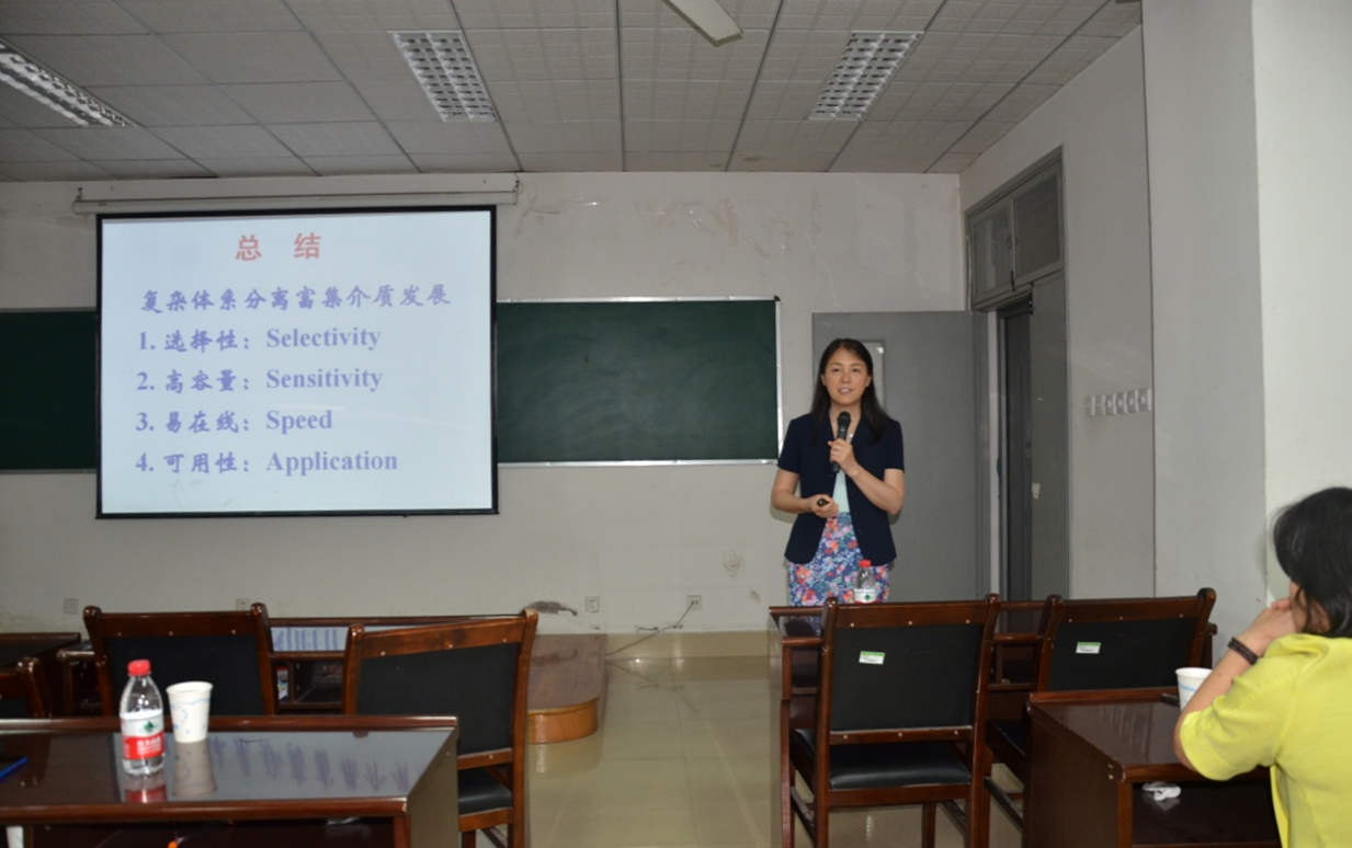 报告中,李攻科教授主要介绍了样品前处理进展;微孔有机聚合物固相微萃取介质;磁性聚亚苯基共轭微孔聚合物介质;腙键共价有机聚合物在线微固相萃取介质;动态共价凝胶在线固相微萃取介质;磁性烃基葫芦(8)脲微固相萃取介质。报告结束,李攻科教授对提出的问题一一进行了耐心的解答。