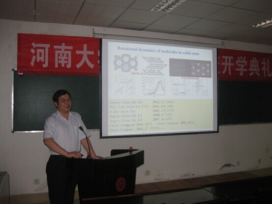 龙腊生教授为与会老师、同学做了题为“高核稀土及稀土-过渡金属簇合物的设计合成及其磁热效应的研究”的报告。他首先简单介绍了金属簇合物的分类及其定义,并结合我国丰富的稀土资源确定其研究方向。随后,龙教授着重讲解了磁热效应、磁制冷材料选择依据以及所需解决的问题。通过理论知识的指导,总结出磁制冷材料的设计合成策略。整场报告精彩纷呈,龙教授渊博的知识使在场师生收获颇多。
