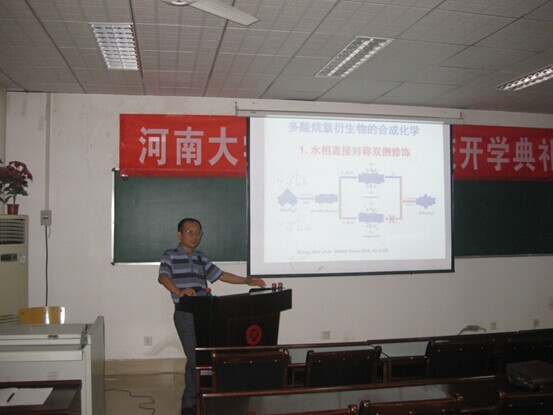 教师、研究生作了题为“多酸有机衍生物化学”的报告,报告中魏教授主要从合成化学和反应化学两大部分介绍。他认为,多酸纳米簇具有可控的化学反应位点,在一定条件下可以被有机-无机配体取代。在合成化学中,魏教授分别介绍了亚胺、烷氧、含吸电子的芳香亚胺等衍生物的合成化学。深入浅出的讲解,图文并茂的展示使老师、学生获益匪浅。