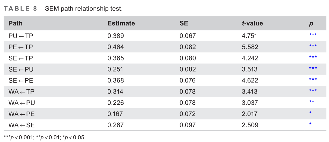 研究结果表明,上述四个因素对师范生使用人工智能技术的意愿有直接影响。此外,中介分析表明,感知有用性、感知易用性和自我效能感在TPACK与使用人工智能技术意愿的关系中起着显著的中介作用 (部分发现如下表)。