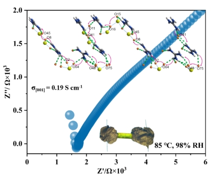 质子交换膜燃料电池由于具有超低排放、超高功率,绿色高效优势,受到关注。其核心质子交换膜如商业化的Nafion具有高的质子导电率,优异的稳定性及耐用性等优势,然而其价格昂贵,结晶性差,无法很好地探究结构与性能之间的关系,从而影响了对质子导电机制的研究。因而构筑具有高质子导电性、结构明确的新型质子传导材料具有挑战性和紧迫性。而单晶质子导电材料,可以提供清晰可见的质子传输途径,更好地解释质子传输机制,有利于探究结构与性能之间的关系。