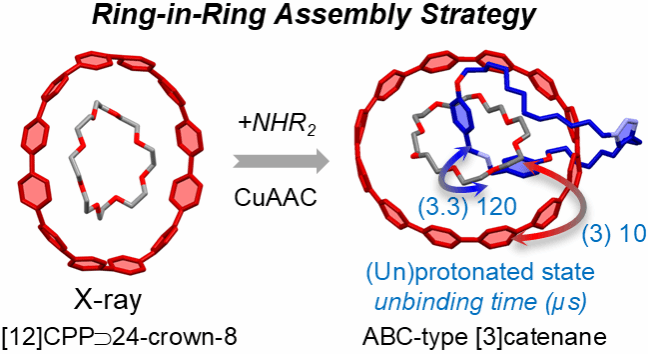 机械互锁分子(Mechanically Interlocked Molecules,MIMs)由两个或多个分子单元组成,这些单元之间并非通过传统的化学键相连,而是由于特定的分子拓扑结构所致。经典的例子包括轮烷(Rotaxanes)、索烃(Catenanes)和分子结(Molecular knots)。由于MIMs的组成部分之间并未通过刚性的共价键相连接,其组分的相对位置通常具有高度的动态性。这一特性已被广泛应用于多个领域,包括分子机器、催化和药物递送系统等。刚性共轭碳纳米环(如环对苯撑,CPPs)及其衍生物因其独特的径向连续π-共轭结构,在尺寸依赖性带隙调控等方面展现了显著优势。自2008年首次合成以来,这类分子吸引了广泛关注,最初因其在碳纳米管自下而上的合成中的潜力而备受期待,随后逐渐应用于超分子化学、催化和有机电子学等领域。然而,典型的CPP结构因其刚性空腔和缺乏金属配位或氢键位点的特性,一直未能广泛应用于机械互锁分子的设计和构建。