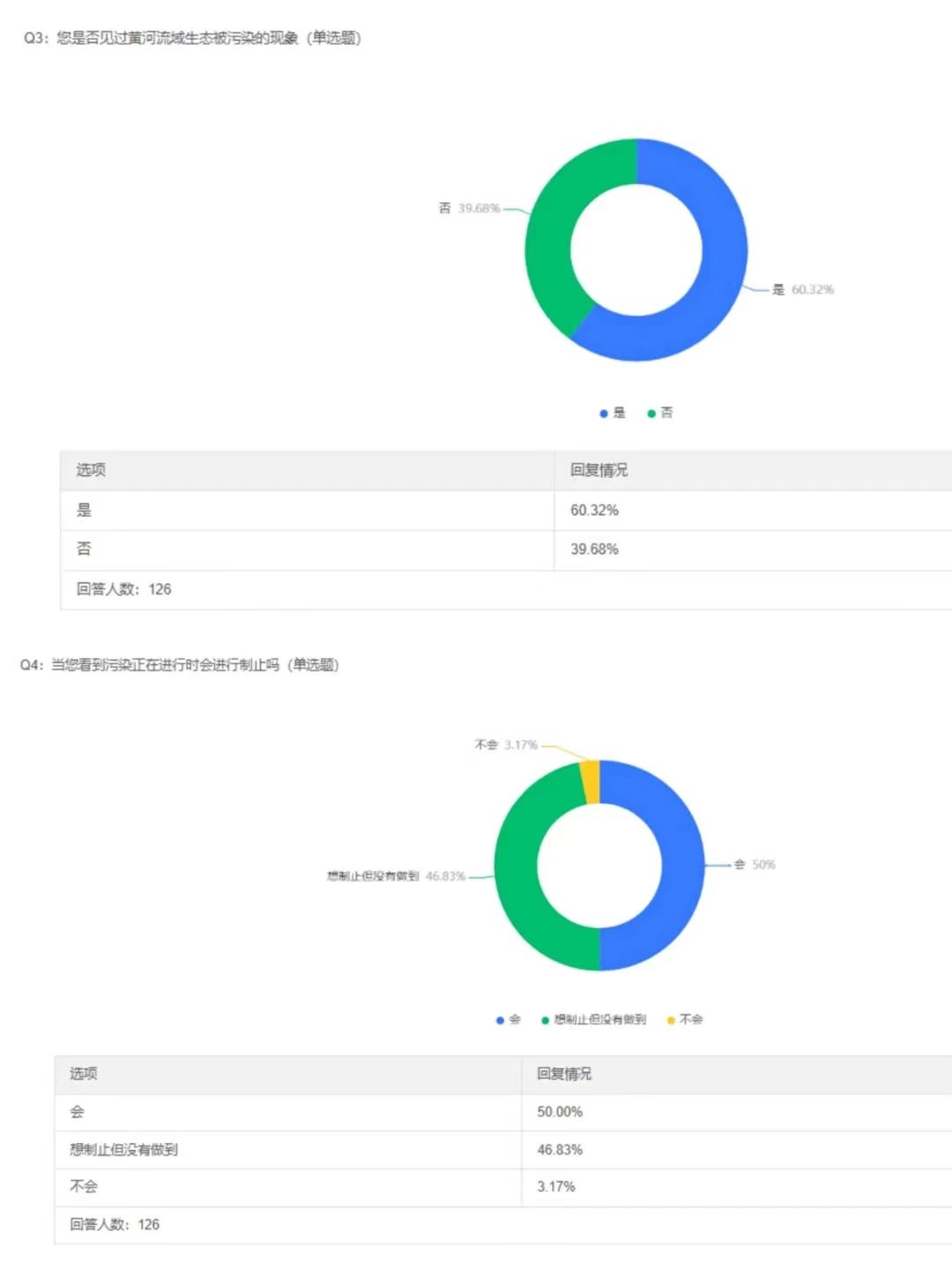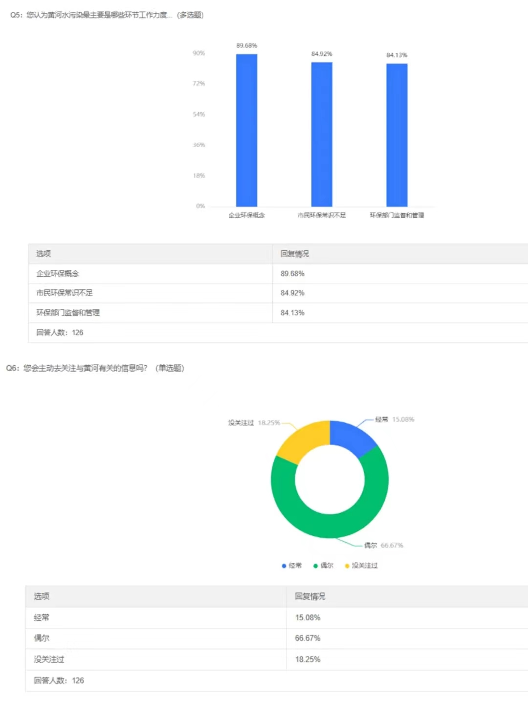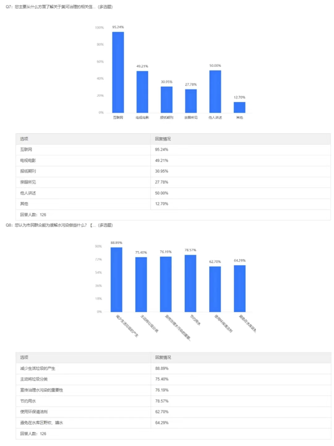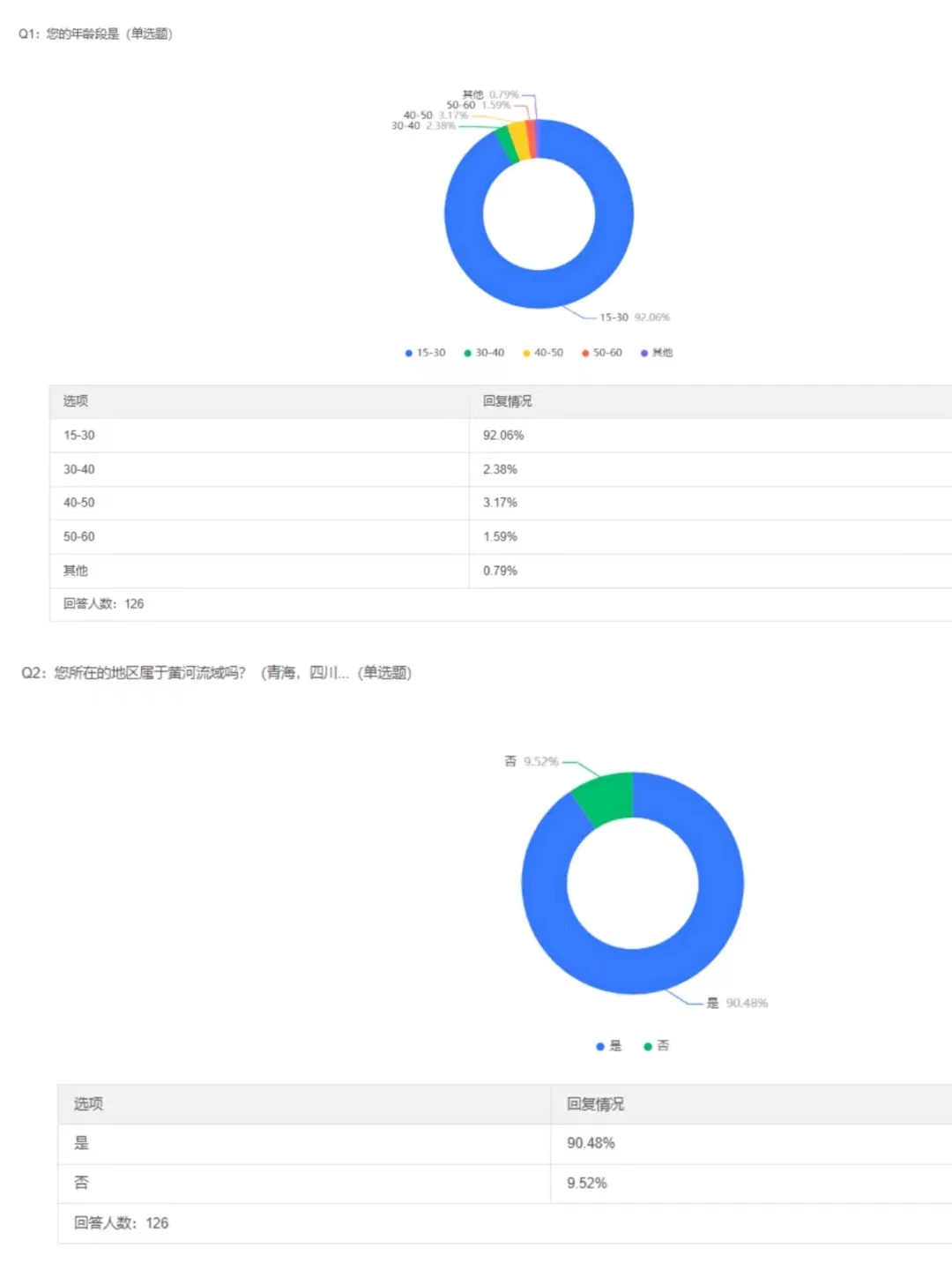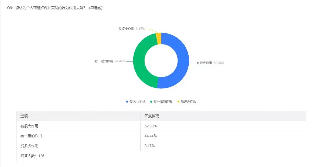 队员们通过多渠道积极动员身边的朋友、家人和邻居等填写问卷。问卷共设置9道题目,涉及黄河流域水资源情况的多个方面。经过两天的调研,本次问卷调研共收集了126份结果,其中90%以上为15至30岁的青年且所在地区属于黄河流域,结果显示,大部分青年都有保护黄河的意识,会通过网络去关注与黄河有关的信息。队员们对调研结果进行了讨论并确定宣讲重点:让青年进一步了解保护黄河的具体措施,以及对不熟悉网络、无法从网络获取相关黄河信息的中老年群体宣传黄河知识,鼓励,引导其参与到保护黄河的长久行动中。