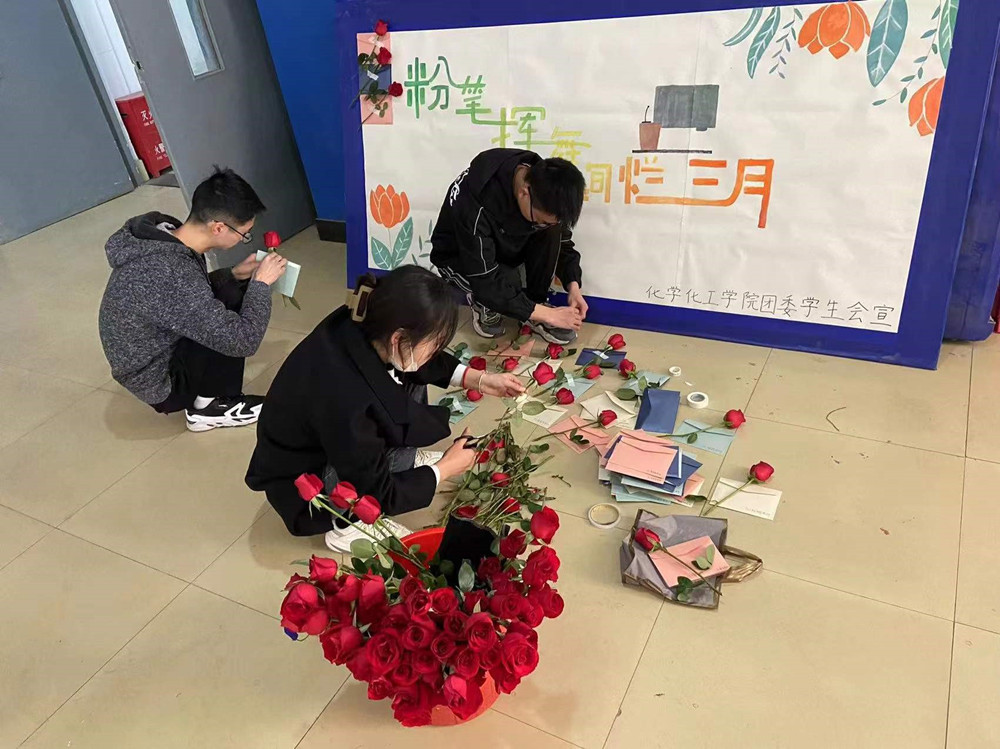 建校110周年、纪念“三八”国际劳动妇女节112周年,传递学院对广大女教师的关爱,增强女教师与同学们的联系,3月8日上午,由化学化工学院团委学生会主办的“以花为媒,以字寄情”主题活动在学院一楼大厅举行。