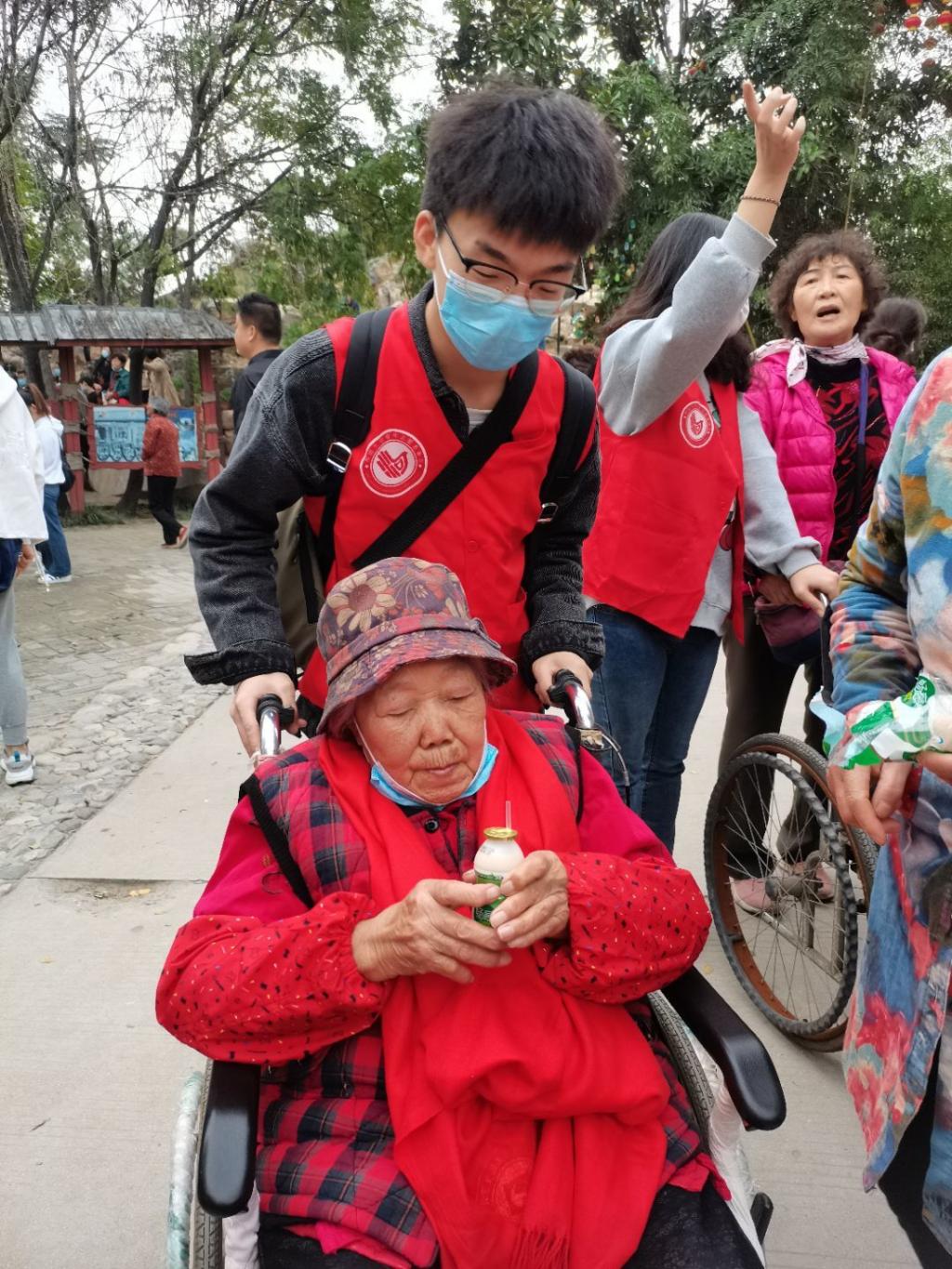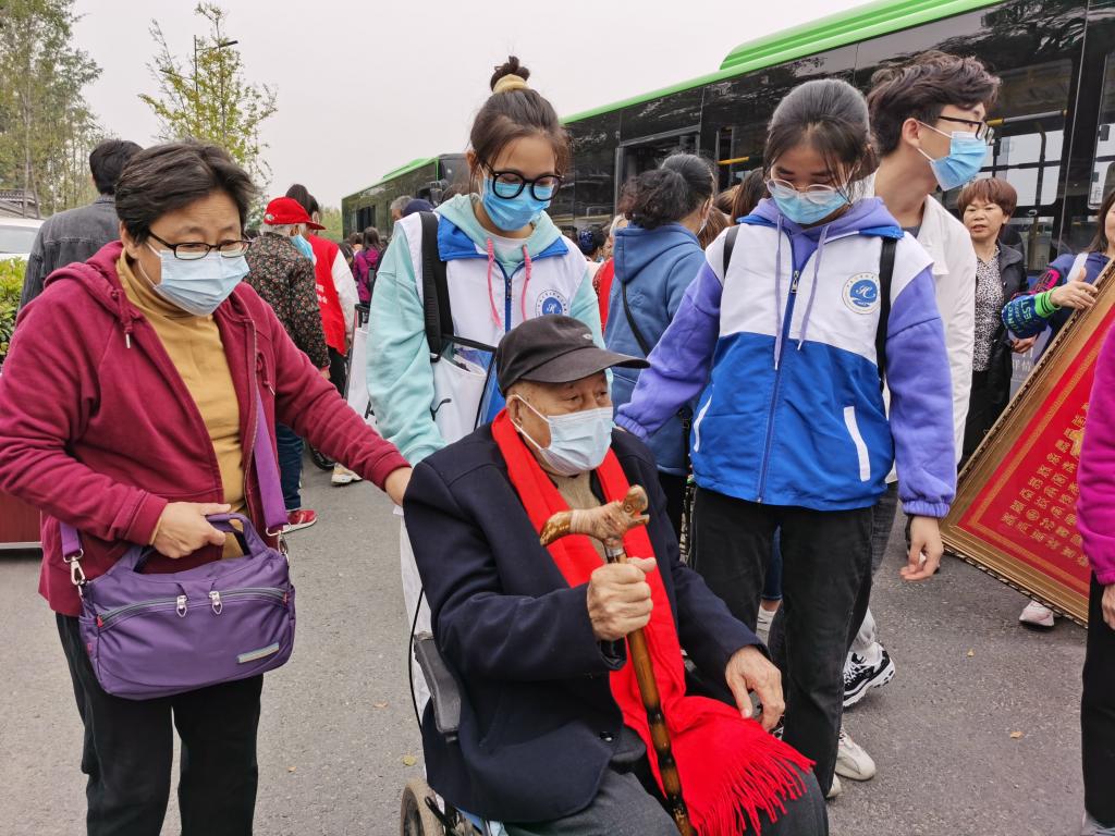 14日下午,志愿者们在北门分成两批前往万岁山大宋武侠城的中门,在全部人员到来后,志愿者们听从负责人的安排,穿上学院的志愿服装,静静等待老人们的到来。在与敬老院负责人的沟通后,志愿者们积极帮助老人下车,并推他们进入景区游玩,每个老人的身边都有着志愿者的身影。