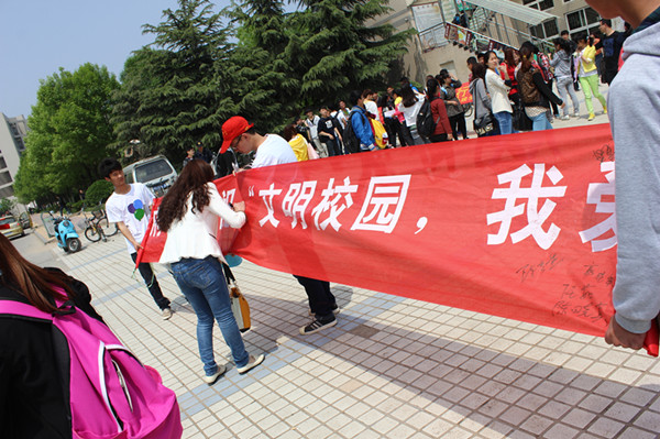 2012级应用化学专业的同学们在三号教学楼义务打扫教室,开展了以“文明校园,爱我河大”为主题的团日活动。