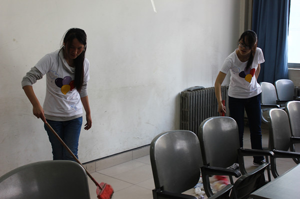 经过前期协商,12点半在保洁阿姨的指导下,身着白色短袖的应用化学专业同学准时开始打扫教室。历时一个小时的紧张忙碌,教室内大量垃圾被清理出来,这让之前未接触过清洁工作的同学倍感清洁工作的不易。该班生活委员方磊说:“这样的角色互换,就是想让同学体验清洁工作的辛苦,在今后能以这段亲身经历影响身边的人注意环保”在此之前同学们还利用上午的时间在各个教学楼前发宣传页,唤起大家保护教室环境的意识,鼓励大家积极参与营造良好学习环境的活动。