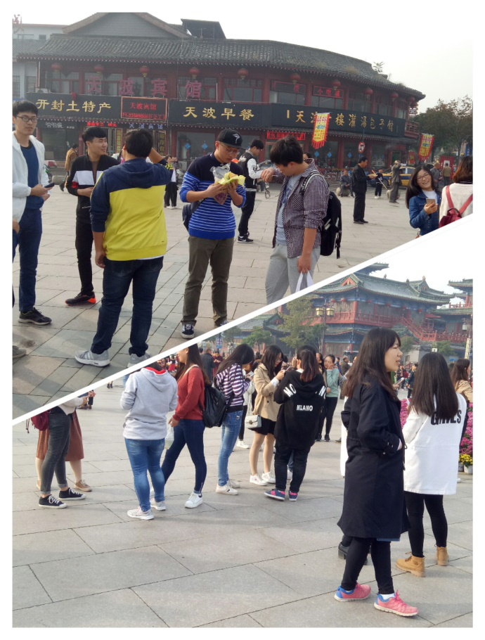 门口集合,并点名,确定所有人员到齐后出发。若有不到者,向班长请假。8点10分准时出发,乘坐34路公交车前往龙亭。