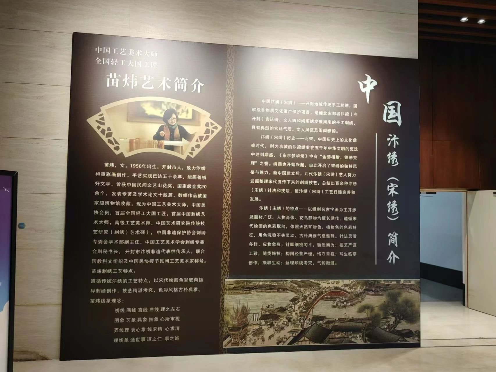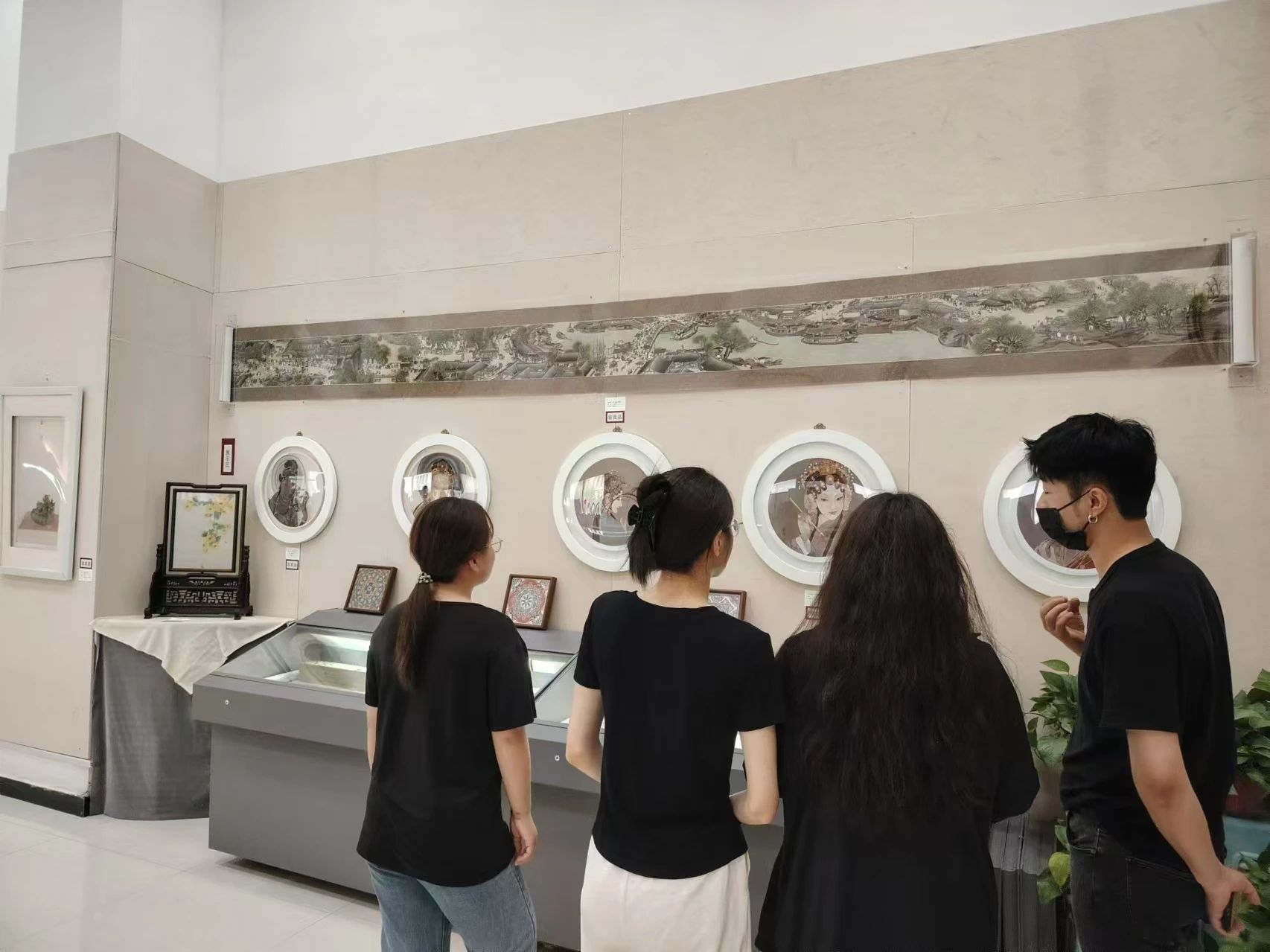 团队首先前往河南省开封博物馆,参观了开封博物馆中汴绣的展览区域,在博物馆老师的带领下,初步认识到了汴绣的精妙之处。在谈及为什么学习汴绣时,老师回答,因为热爱,所以坚持。在当今的时代背景下,汴绣的传承需要更多这样的年轻血液加入,来发扬汴绣文化。此次参观活动让团队成员们了解了汴绣的历史,感受到了汴绣的魅力。