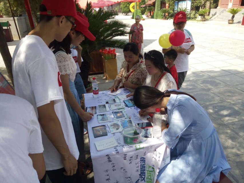 一个签名,一份承诺,以美之名,传递文明。志愿者们拉起了“文明背包行”支持签名,鼓励过往游客加入文明旅游的团队。在志愿者的辛勤宣讲下,越来越多的游客在条幅上签下自己的姓名。潇洒的字体、灿烂的笑容,看到条幅上逐渐增多的签名以及游客们认同的笑容,志愿者们倍感欣慰,斗志昂扬。