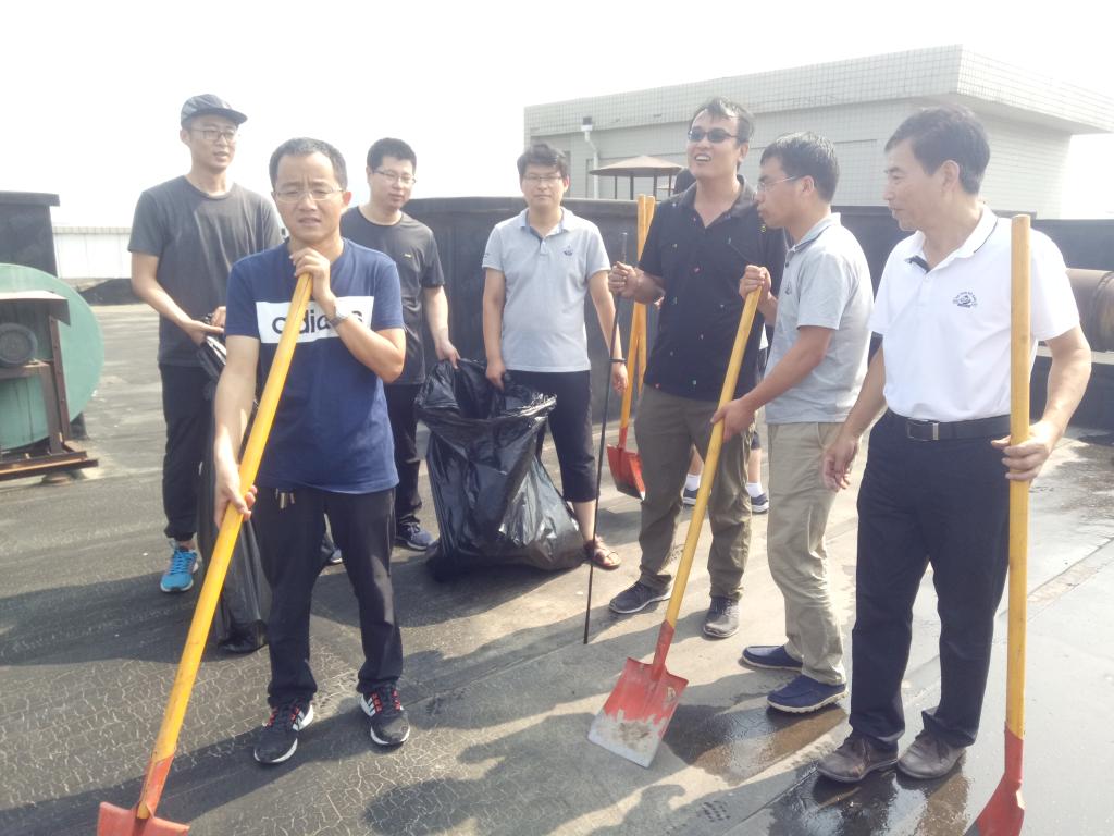 部分教职工在院大厅集合。经过简明扼要的动员演讲,义务劳动有条不紊的展开了。教职工被分为四队,一队负责整理化工院六楼楼顶废弃物,还有一队则用扫帚清扫化工院门口至中州路的道路及空闲地带,另外两队则分别清除学院附近树丛、花坛的垃圾杂物,清理枯枝杂叶等。