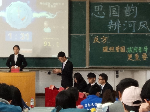 则以理性爱国:政府引导更重要为中心,陈述己方“理性爱国需要政府对民众引导”这一观点。攻辩环节,我方选手据理力争,引经据典, 口若悬河,以“政府引导”的优势为核心分点论述,条理清晰、逻辑合理;总结陈词,八叉书库
