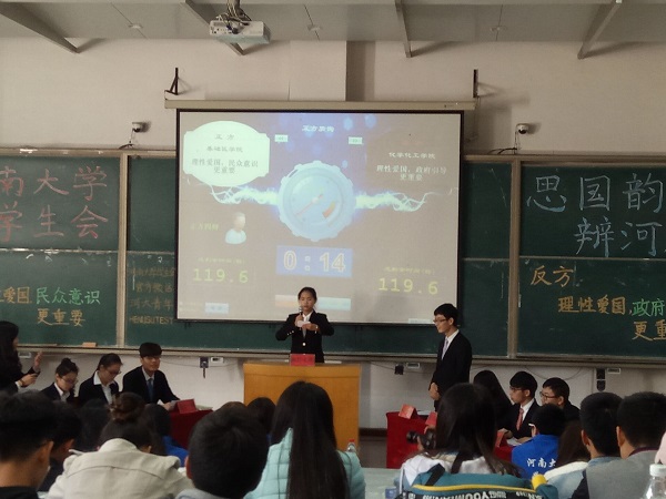 担任反方,辩题为“理性爱国,政府引导更重要”。在开篇立论环节,医学院作为正方以理性爱国:民众意识更重要为中心,简明严谨地阐述“爱国的表现具体在于民众意识”这一观点;相反,八叉书库