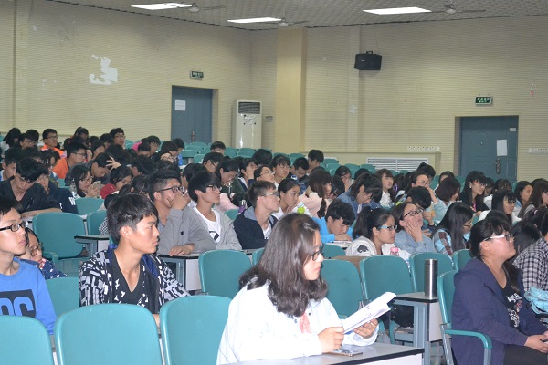 团委负责人、2015级辅导员郭佳在学院学术报告厅二楼召开年级会议,2015级全体学生与会。