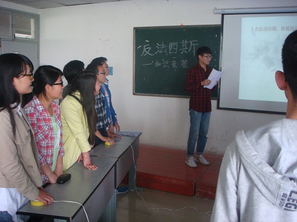 本次比赛分竞答和对答两个环节进行,新颖的竞赛方式激发了参赛者的激情和观众的热情。竞答阶段,比赛采取抢答的形式,为了增加本队的得分几率,每一位参赛选手都聚精会神,目不转睛的盯着自己的按钮,只待主持人的答题号令发出。期间,参赛选手的紧张专注,观众的饱满热情,使比赛更显妙趣横生。对答阶段,比赛采取高分队伍给低分队伍挑题的方式进行,题目包括单选、多选、填空。用多样的答题模式来考察选手们对反法西斯历史的认知,不仅增加了比赛的趣味性,更彰显了八叉书库