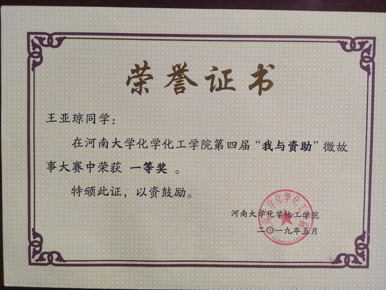 第六届“助学•筑梦•铸人”主题宣传活动征文作品二等奖、化学化工学院第四届“我与资助”微故事大赛一等奖、以主要负责人身份参加了省级大学生创新创业计划项目,参加了第二届华中赛区全国大学生化学实验创新设计竞赛,专业成绩始终名列前茅。