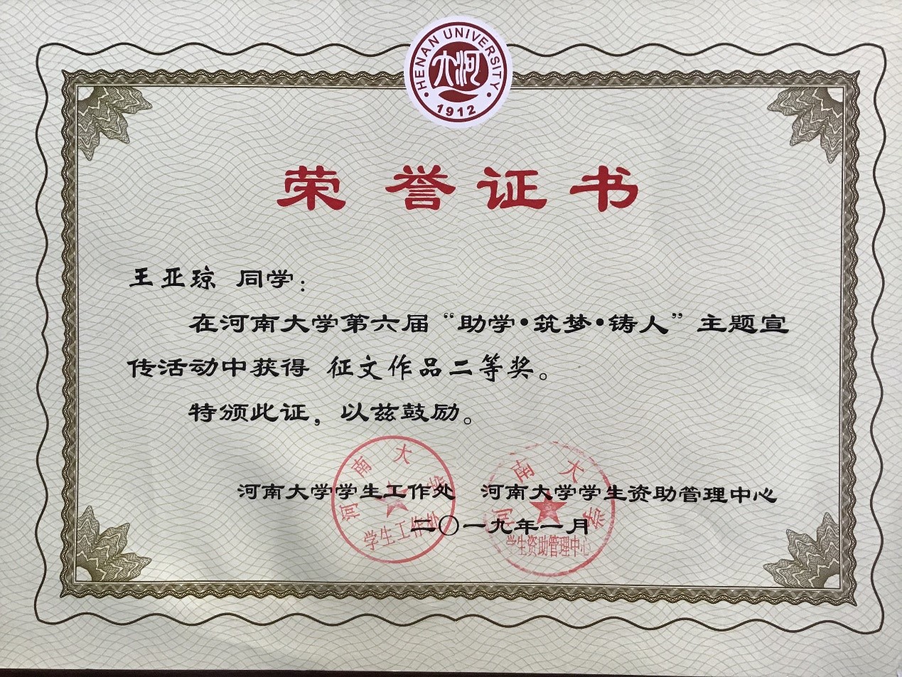 在国家和学校的帮助下,家庭并不富裕的她比别人更加自强。但她有着不懈奋斗的信念,有着刻苦勤奋的毅力,有着踏实能干的作风。为了工作,她见到过凌晨五点钟的河大,为了学习,她也见到过晚上十一点钟的校园。