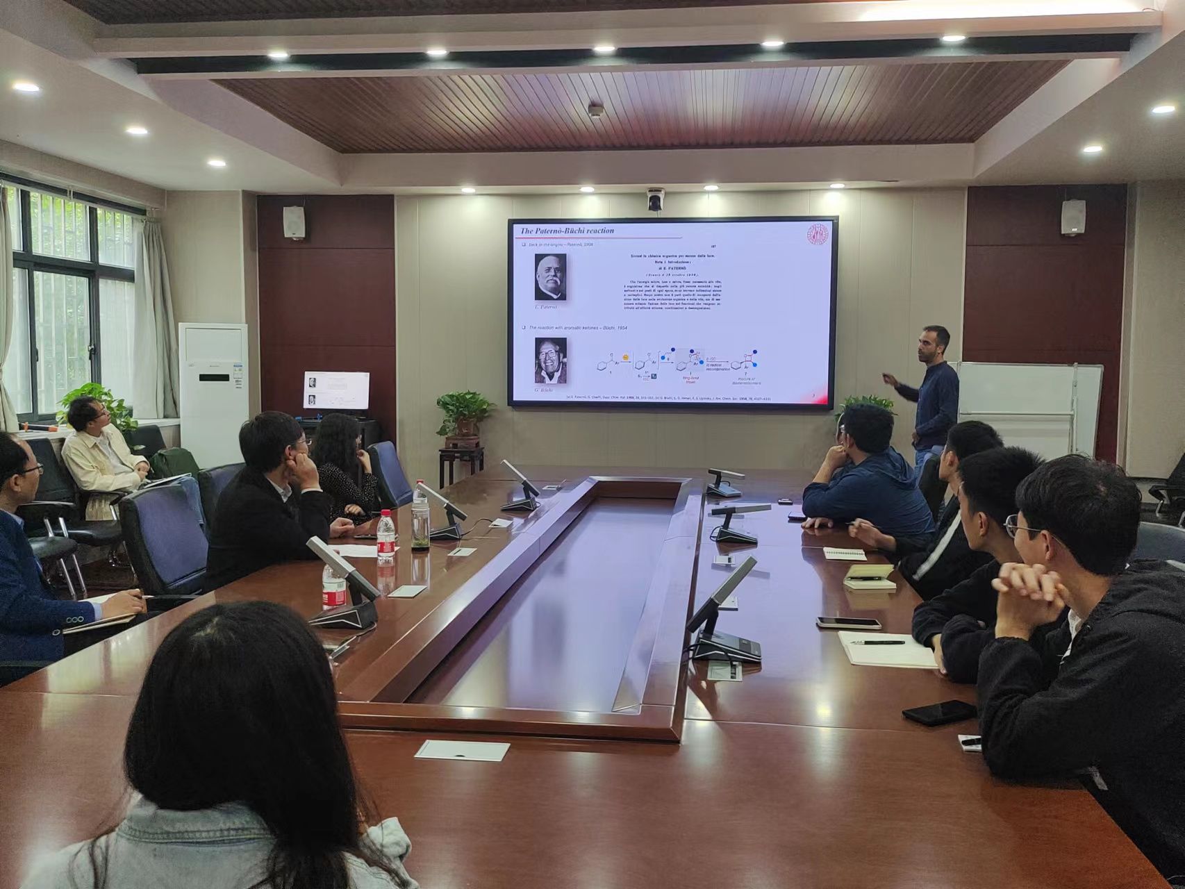 报告中,Luca Dell’Amico详细介绍了其课题组近年来在光促进的新反应以及有机光敏剂开发及应用领域的研究进展。他围绕有机光敏剂的开发及设计等方向详述了一系列芳胺衍生的有机小分子光敏剂光物理化学性质的表征,及其在光促进[2+2]反应中的应用,并讲解了光物理检测手段在光反应机理研究中的应用特点,详细说明了影响光[2+2]反应构建氧杂四元环的关键因素,重点阐述了调控化学选择性的方有效法。报告结束后,他与参会师生进行了深入交流,并全面回答了大家提出的问题。