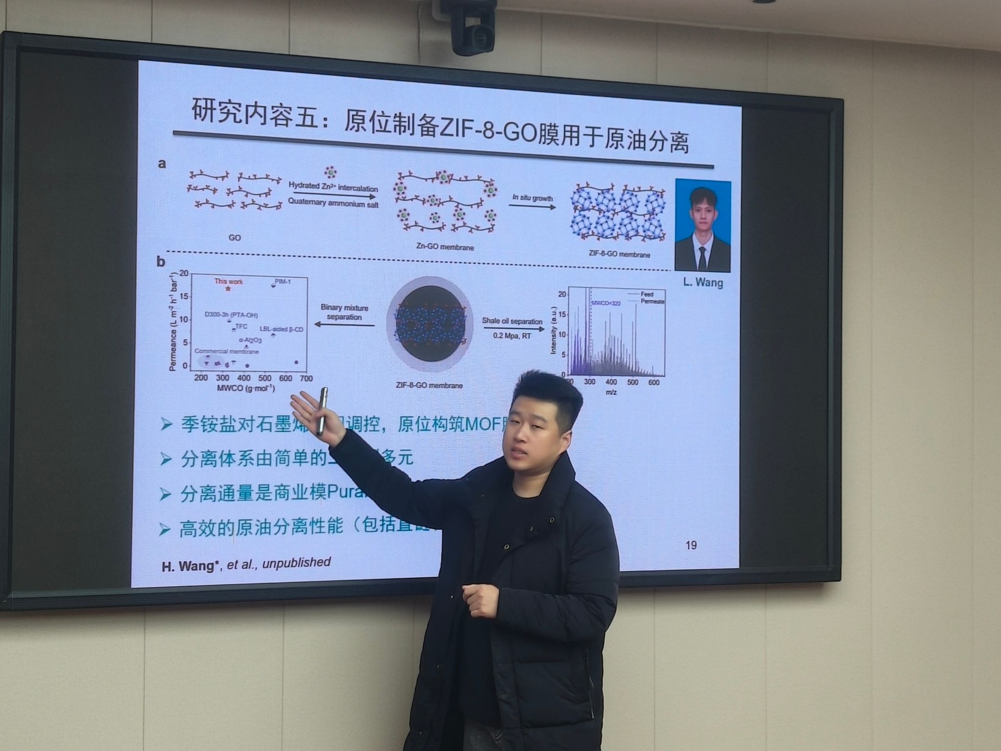 报告中,王航介绍了一系列基于MOF膜制备的技术,包括:利用低共熔溶剂辅助热压法原位制备Zr-MOF膜用于废水治理,原位构筑MOF-石墨烯膜实现高效离子分离,电化学法制备Zr-MOF膜用于盐差发电,调控石墨烯层间距制备MOF膜用于原油分离。同时,王老师发展了石墨烯模板调控MOF粒径的方法,为MOF材料在液相分离领域提供了科学基础。报告结束后,他与参会师生进行了深入交流,并全面回答了大家提出的问题。