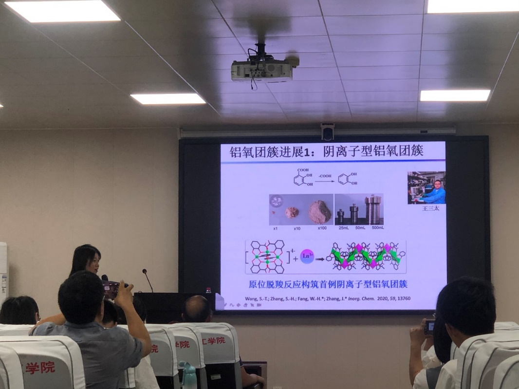 在第一场报告中,方伟慧研究员介绍了铝氧团簇的研究现状及课题组的最新研究成果。其中,采用配位延迟水解策略,合成得到一系列具有光限幅效应的类水滑石铝氧团簇,该类化合物是目前该领域中核数最高的铝氧团簇。