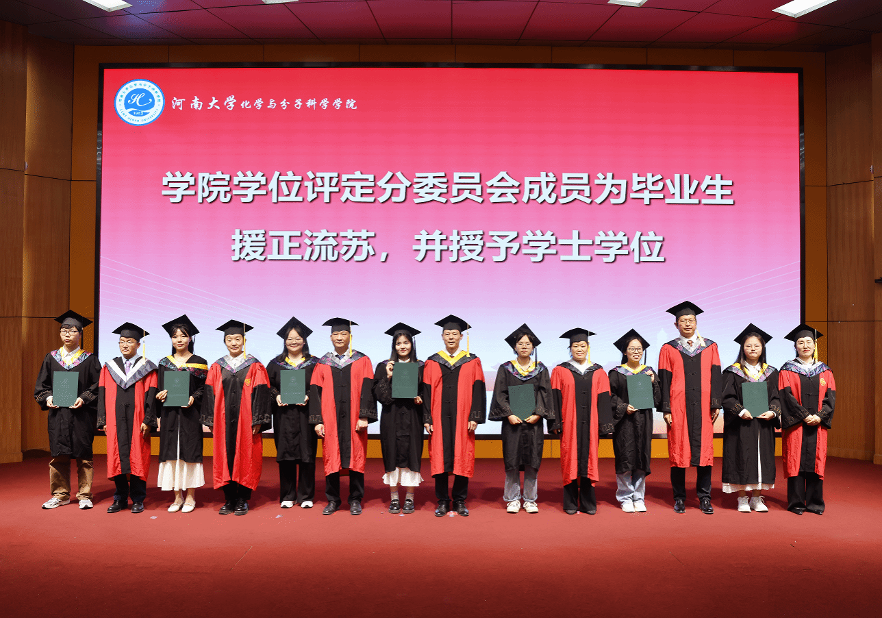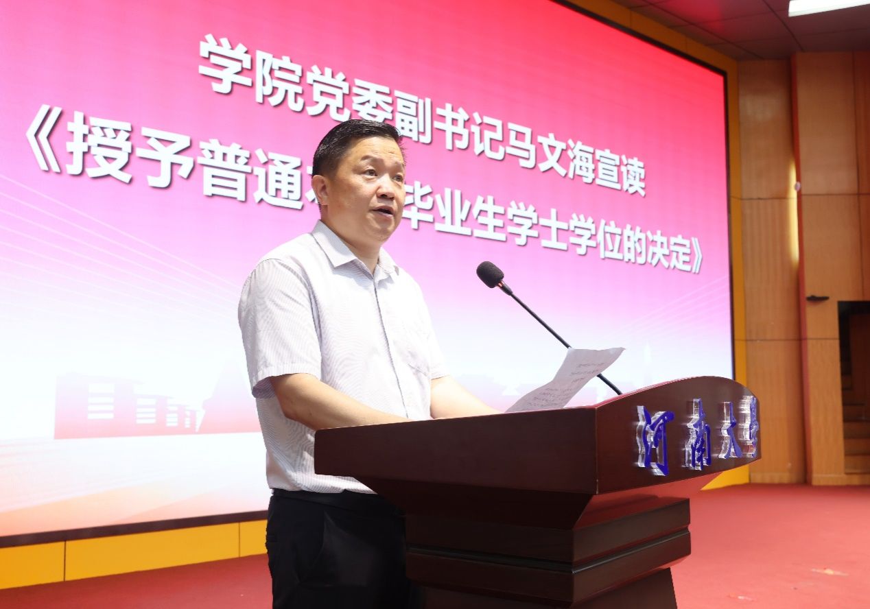 在庄严的国歌声中,2025届本科毕业生毕业典礼暨学位授予仪式拉开序幕。学院党委副书记马文海宣读《授予普通本科毕业生学士学位的决定》。在欢快的乐曲中,毕业生们相继上台,学院学位评定分委员会老师们为毕业生援正流苏,颁发学位证书并合影留念。